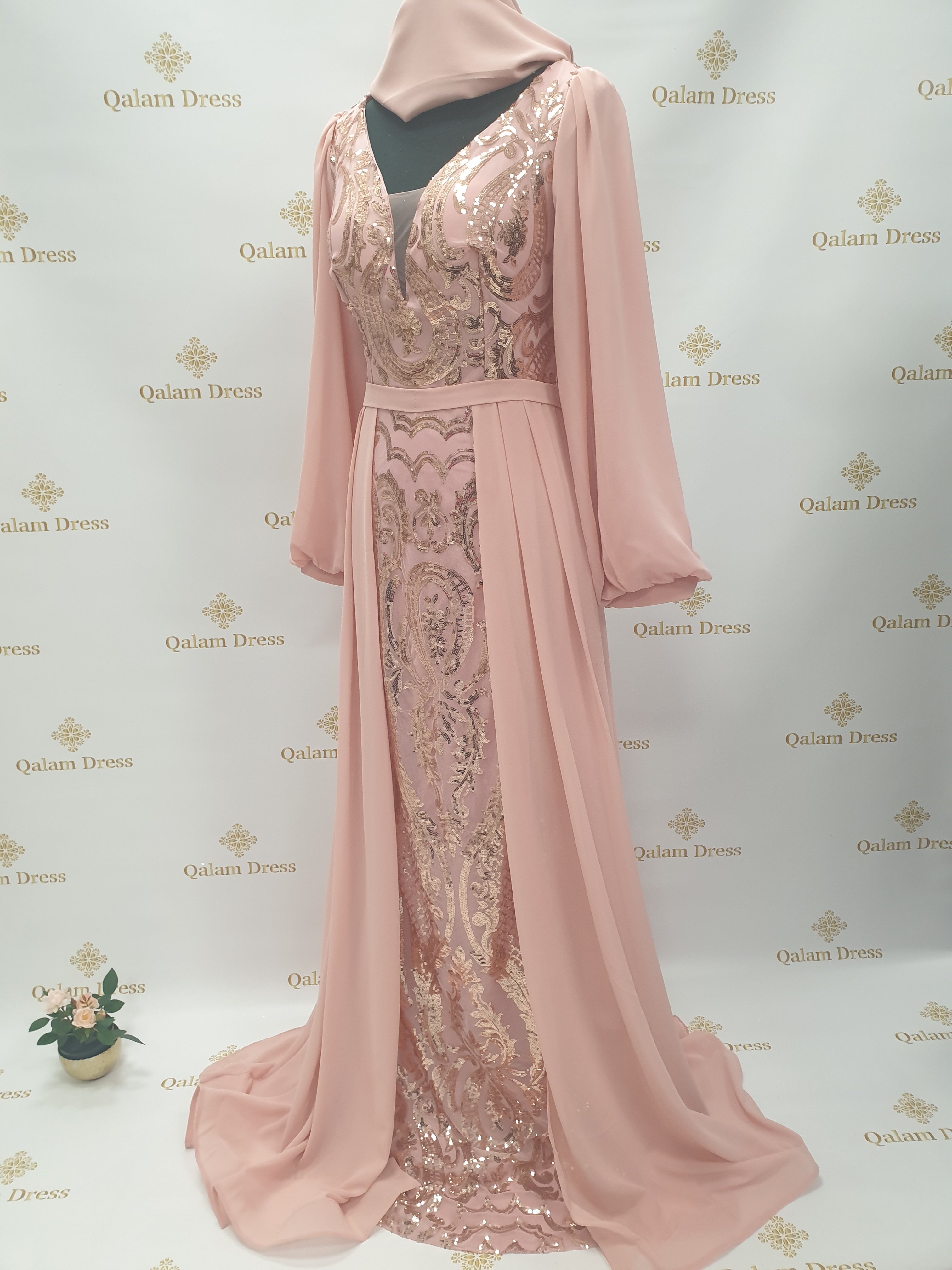 Grâce a son tissu en mousseline avec ses manches bouffantes et une traine, la robe du soir Zineb sera vous habiller et vous faire sortir du lot lors de vos événements.