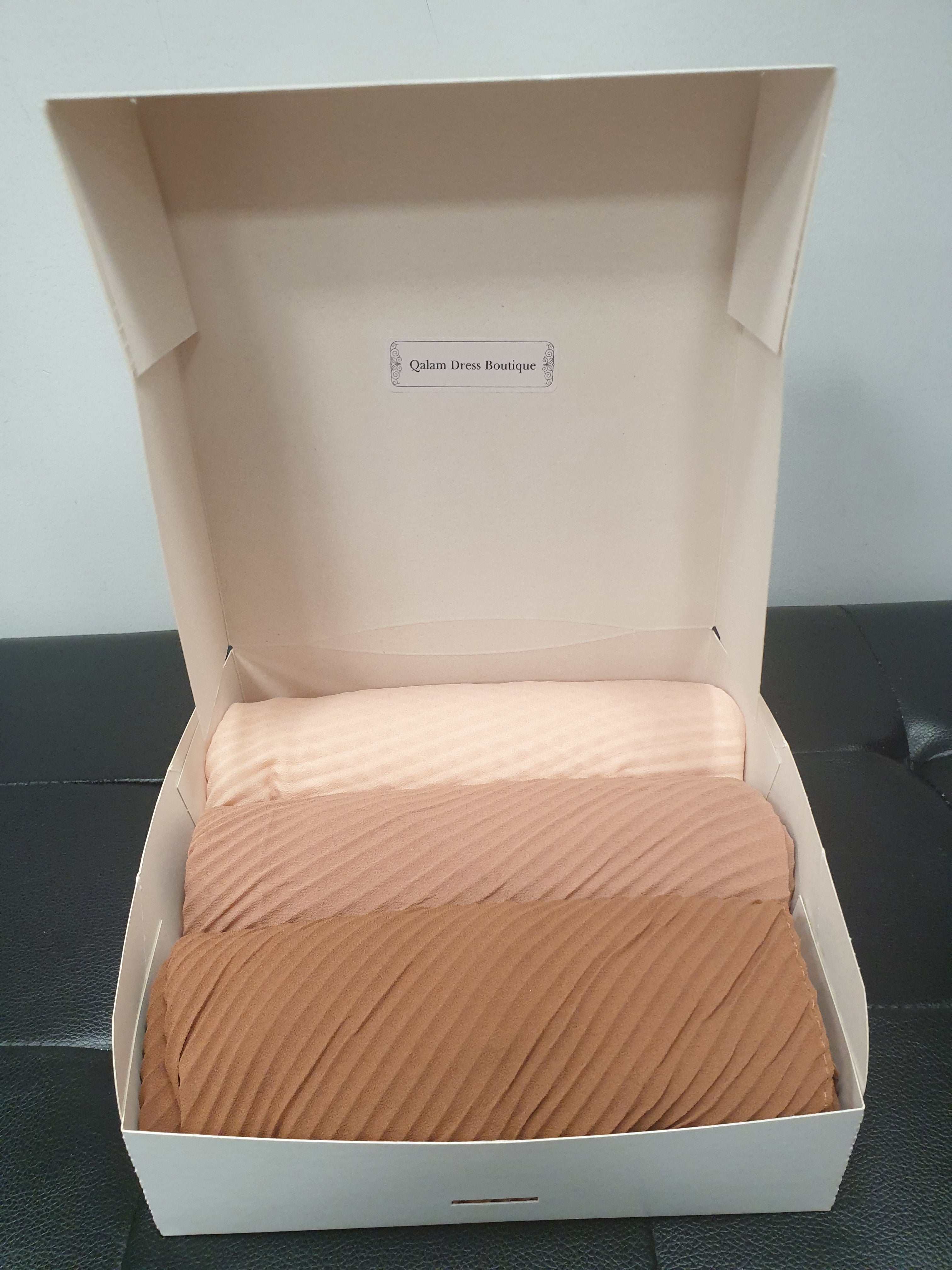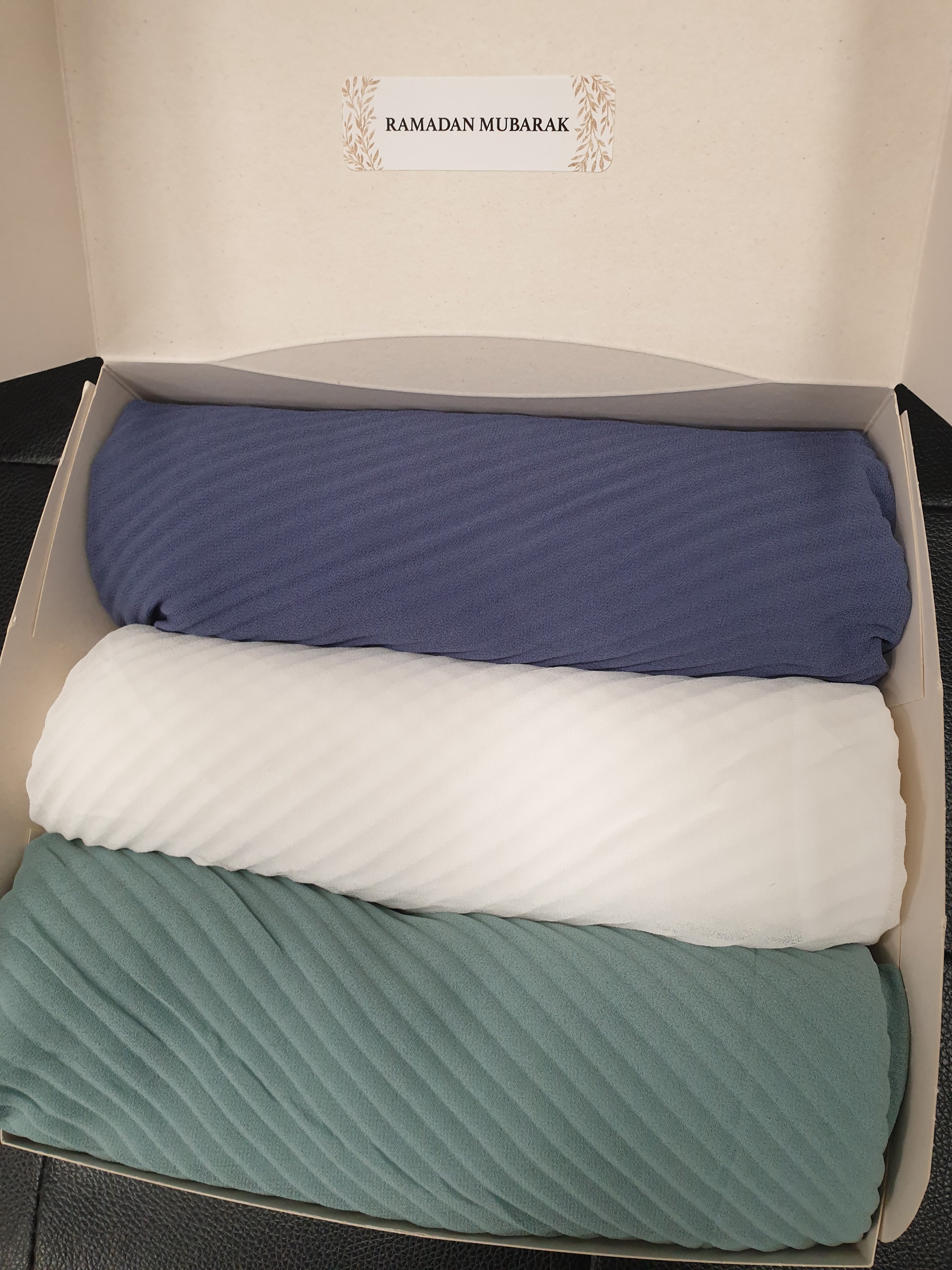 Box pour femme comprenant 3 Hijab mousseline gaufrée, prête à être offerte.